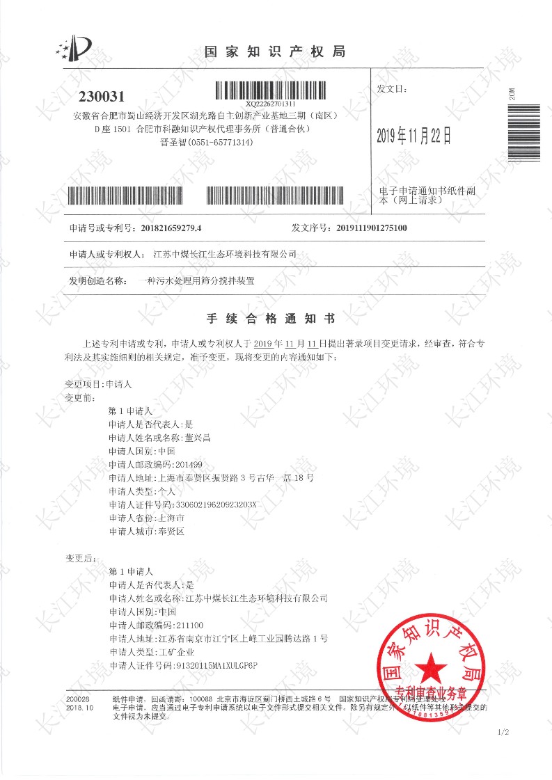 一种污水处理用筛分搅拌装置-实用新型专利证书